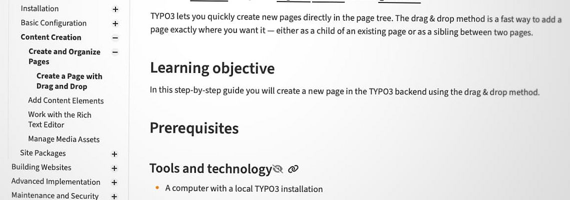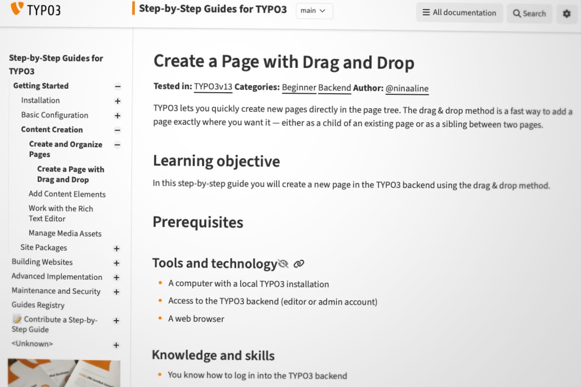 L'apprentissage de TYPO3 doit être pratique, accessible et efficace. Les guides étape par étape aident les utilisateurs à réaliser rapidement des tâches concrètes avec TYPO3, tout en s'appuyant sur la documentation existante pour approfondir leurs connaissances. Que vous soyez un nouvel intégrateur, un développeur explorant le travail d'extension ou simplement quelqu'un qui souhaite essayer quelque chose de concret, ces guides sont faits pour vous.