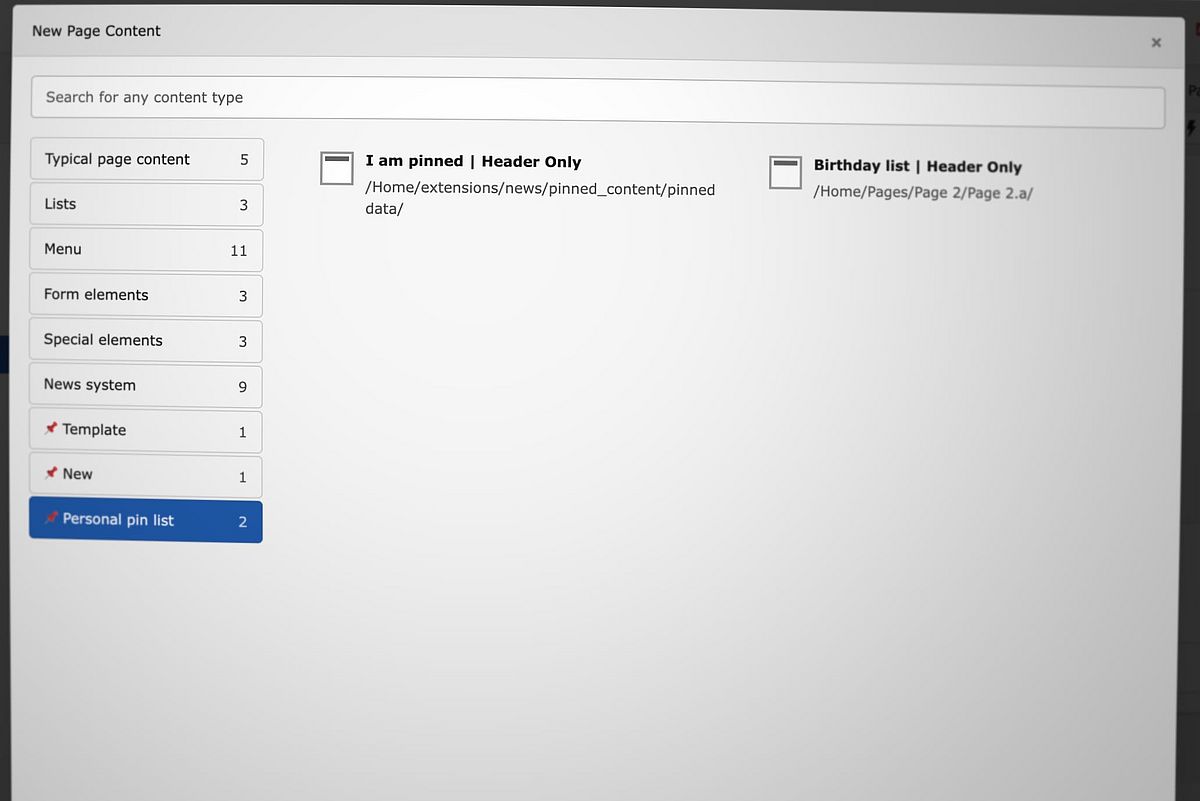 L'extension TYPO3, Pinned Content (pinned_content), améliore l'assistant d'éléments de contenu TYPO3 avec des éléments épinglés, des modèles et des listes d'épingles personnelles pour une édition plus rapide.